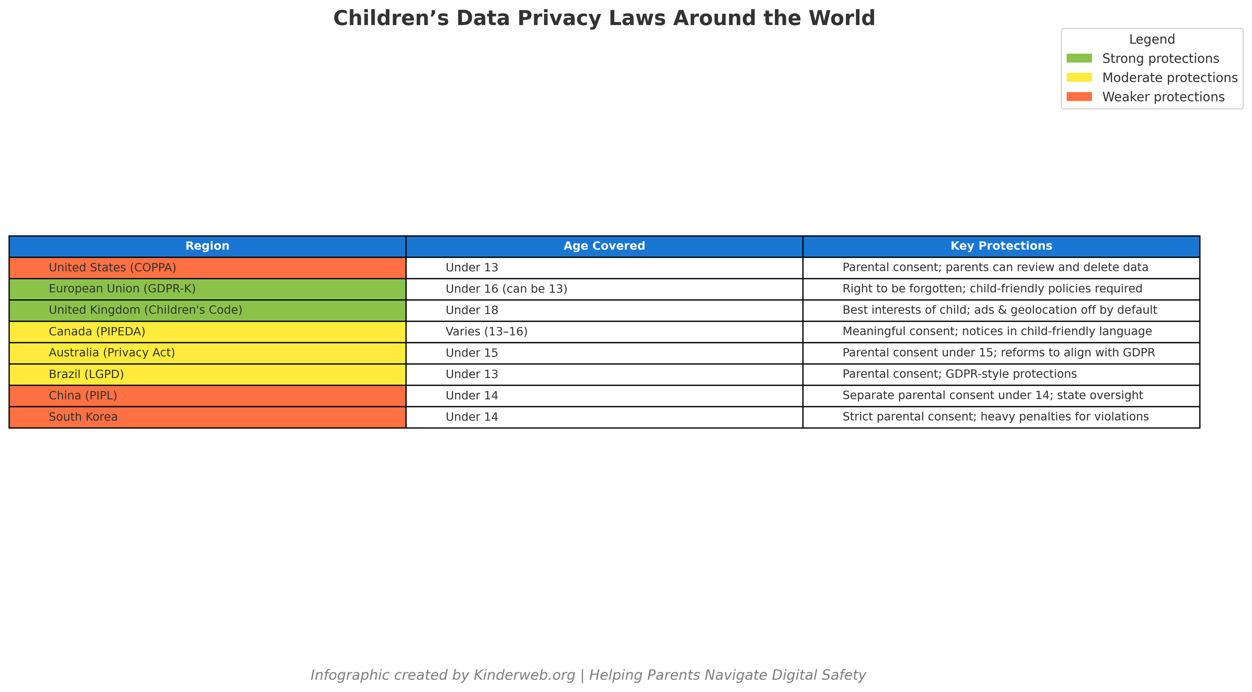 Children are spending more time online than ever before, in classrooms, at home, and even in virtual worlds. With this comes growing concern about how their data is collected, stored, and used by tech companies. Around the globe, governments have introduced laws to protect minors’ privacy online. But the details vary from country to country, and parents and educators often find it difficult to navigate the landscape.